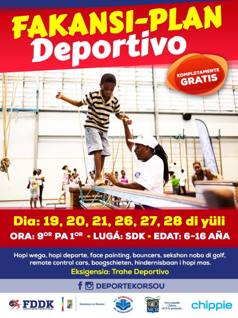 FDDK ta gradisí su partnernan, Gobièrnu di Kòrsou, Chippie, MCB i Refineria Isla, pa yuda hasi e magno evento aki posibel, i ta warda nos muchanan di 6 pa 16 aña for di djamars awor 9’or di mainta pa disfrutá di fakansi ku deporte!
